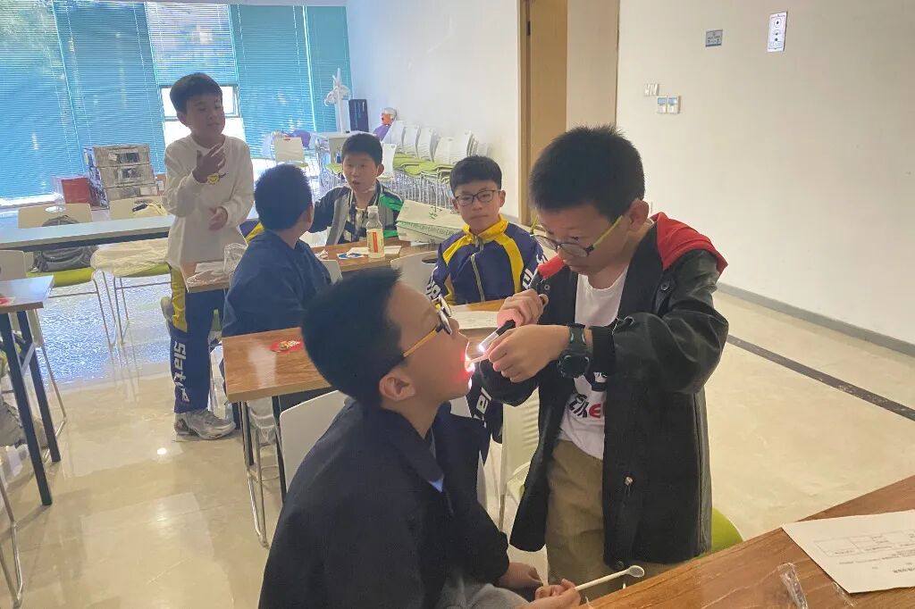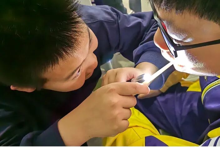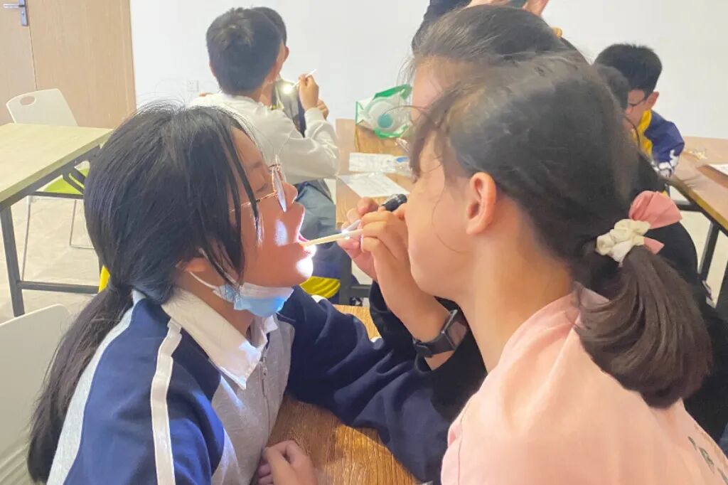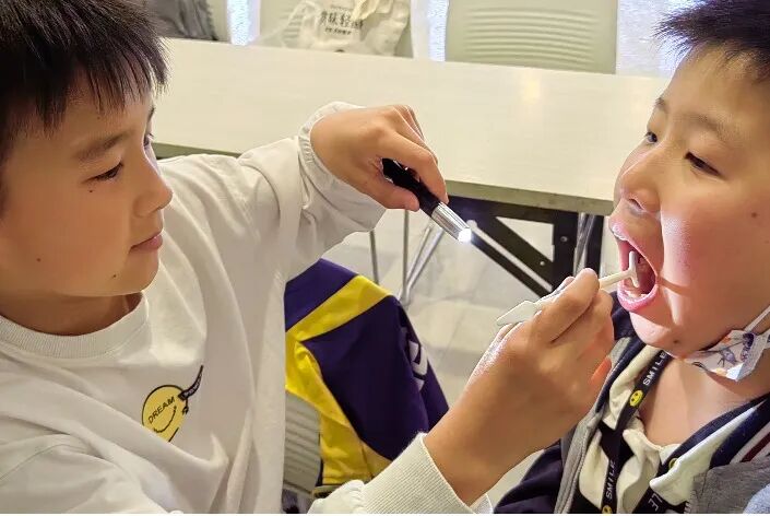 在专业讲师的示范和指导下,小朋友们拿起专业工具,为自己的小伙伴们做了口腔检查,在认真学习牙医工作的过程中,不仅领会了劳动精神的重要性,也学会了如何及时发现自己和家人的口腔问题,并保护口腔健康。